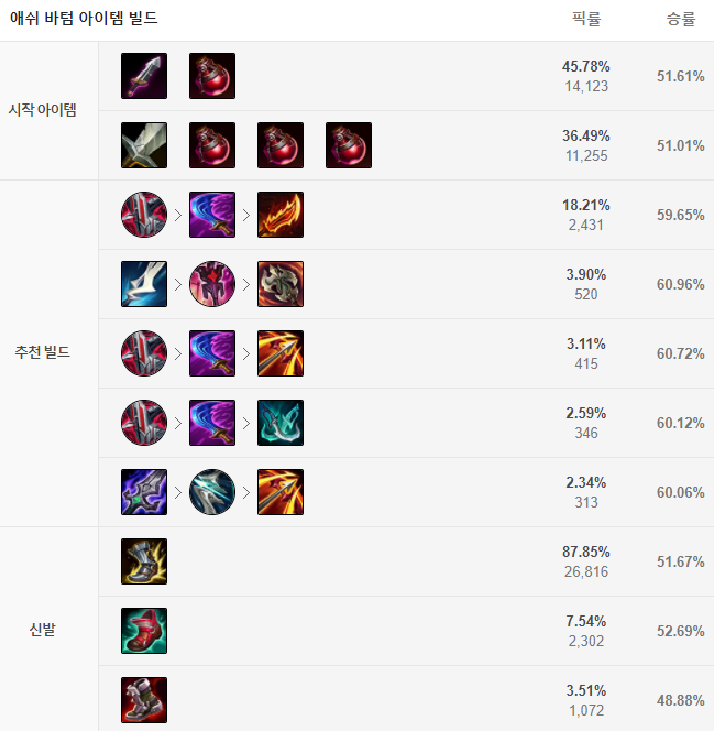 시작 아이템으로는 보통 도란의 검에 포션 한개 또는 롱 소드에 포션 세 개를 갑니다. 딜교가 자주 일어날 것 같으면 초롱소드와 포션 세 개가 좋으며, 딜교가 그렇게 자주 일어나지 않을 것 같은 경우 도란의 검이 더 효율적입니다. 첫 코어 아이템으론느 보통 불멸의 철갑궁을 올려주며 이후 마법사의 최후, 구인수의 격노검을 올려줍니다. 신발은 첫 코어를 띄워준 뒤 광전사의 군화를 올려주면 되겠습니다. 이후에는 루난의 허리케인, 유령 무희, 수호 천사, 도미닉 경의 인사, 필멸자의 운명 등을 유동적으로 올려주면 됩니다.