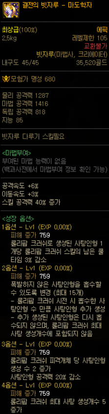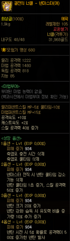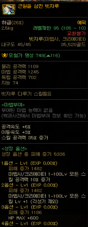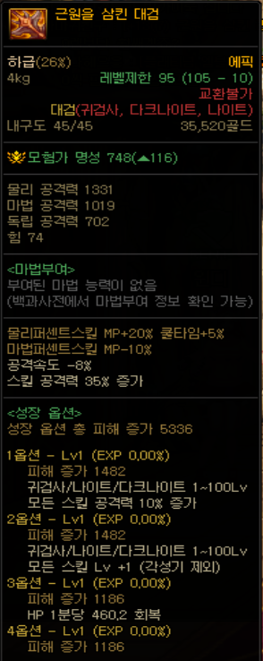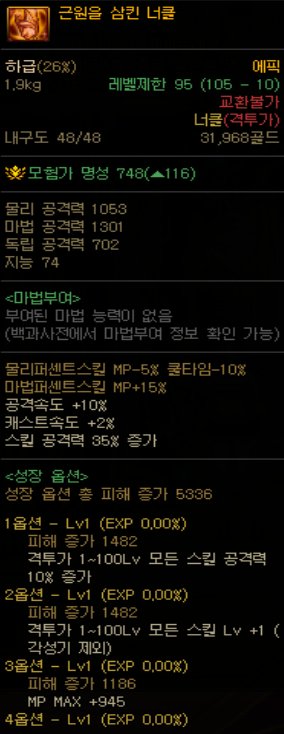 근원을 삼킨 무기는 기본적으로 무난하게 데미지를 증가시키는 옵션들로 이루어져 있습니다. 또한 105레벨 에픽 장비들의 경우 성장이 가능한데, 근원 무기는 결전 무기가 상급던전 2종에서만 드랍되는데에 비해 일반던전 8종과 상급던전 2종 모두에서 드랍되기 때문에 아이템 옵션 레벨을 성장시키기가 쉽다는 장점이 있습니다.