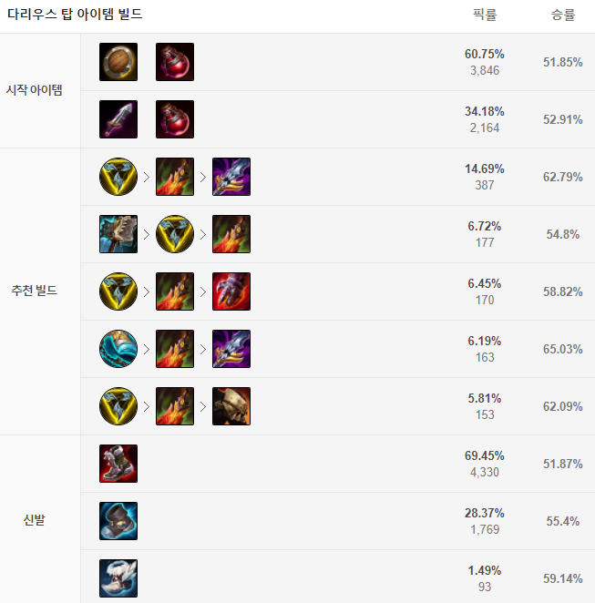 다리우스 템트리의 경우 가장 많이 사용되는 것은 삼위일체 - 죽음의 무도 - 멜모셔스의 아귀 템트리입니다. 신발은 첫 코어 아이템을 띄워준 뒤 상대팀을 보고 판금 장화 또는 헤르메스의 발걸음을 정해주시면 됩니다. 이후의 아이템으로는 상황에 맞게 스테락의 도전, 망자의 갑옷, 가시 갑옷, 대자연의 힘 등을 올려주시면 됩니다.