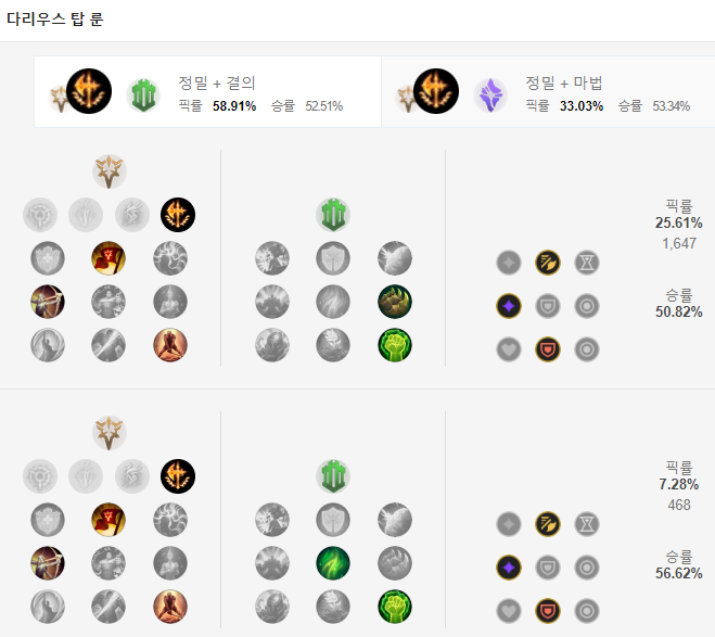 다리우스 룬은 정밀 - 정복자 룬을 메인으로 활용합니다. 하위 룬으로는 승전보, 전설: 민첩함, 최후의 저항을 들어주고 보조룬으로는 결의에서 뼈 방패와 불굴의 의지를 들어줍니다. 룬 파편의 경우 공격 속도, 적응형 능력치, 상대방에 따라 방어력 or 마법 저항력을 들어주면 됩니다.