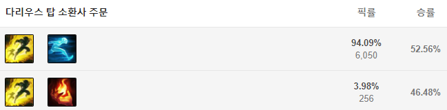다리우스는 점멸과 유체화를 들어줍니다. W스킬 후 평타가 굉장히 강력하고, 기본 평타에도 패시브 출혈데미지가 있어서 평타를 많이 때려야 되는데 돌진기가 없기 때문에 유체화를 들어 손쉽게 접근할 수 있도록 도와줍니다.
