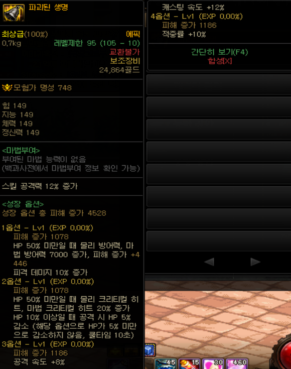 HP가 50% 미만일 때 옵션 효과가 발동되는 보조장비인 파괴된 생명입니다. 누누히 말하지만 아칸셋은 HP가 1%이기 때문에 패널티 없이 효과를 온전히 받을 수 있어서 제일 잘 어울리는 보조장비입니다.