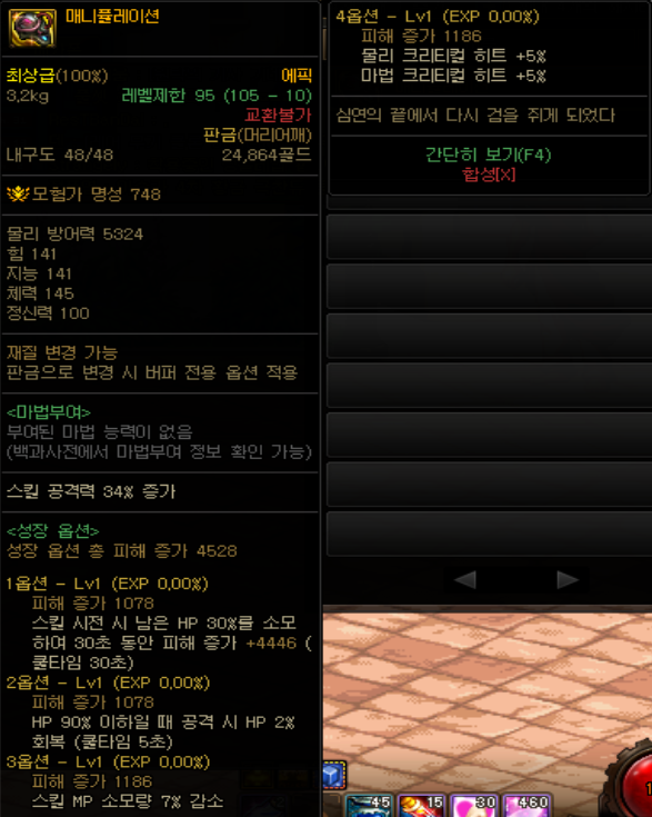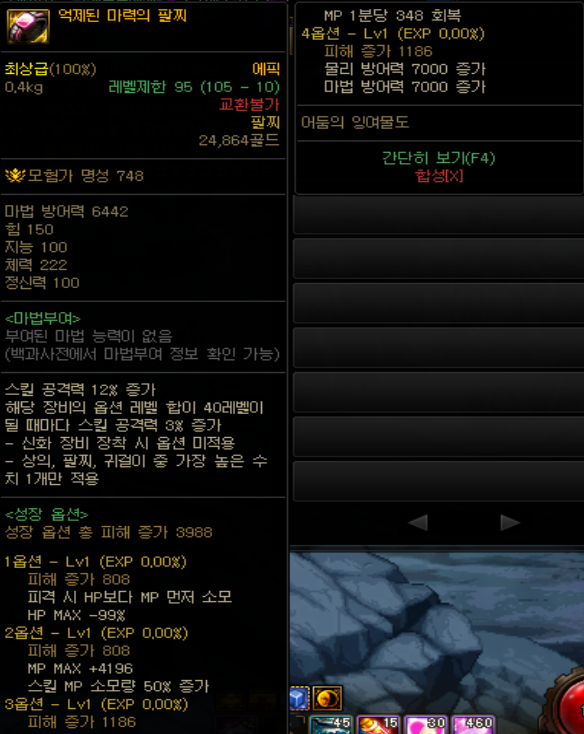 아칸셋의 신화템이라자 핵심 장비인 억제된 마력의 팔찌입니다. 위에서도 말했다시피 HP MAX -99%가 되는 대신 피격 시 HP가 아닌 MP가 소모되게 해주는 장비입니다.