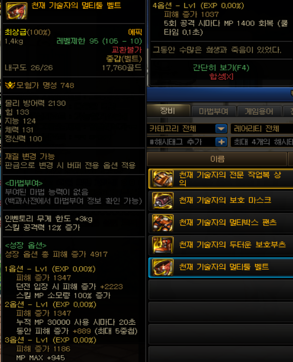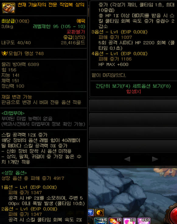 천재 기술자의 전문 작업복 상의는 2옵션인 '공격 시 스킬 쿨타임 회복 속도 2% 증가(최대 10중첩)'를 보고 사용합니다. 이 쿨타임 회복 속도 증가 옵션은 HP 1% 이상 데미지를 받을 때 중첩수가 감소하지만, 아칸셋의 경우 HP가 시작부터 1%고, 피격시 HP가 아니라 MP가 소모되기 때문에 쿨타임 회복 속도 증가 옵션을 온전히 받을 수 있습니다.