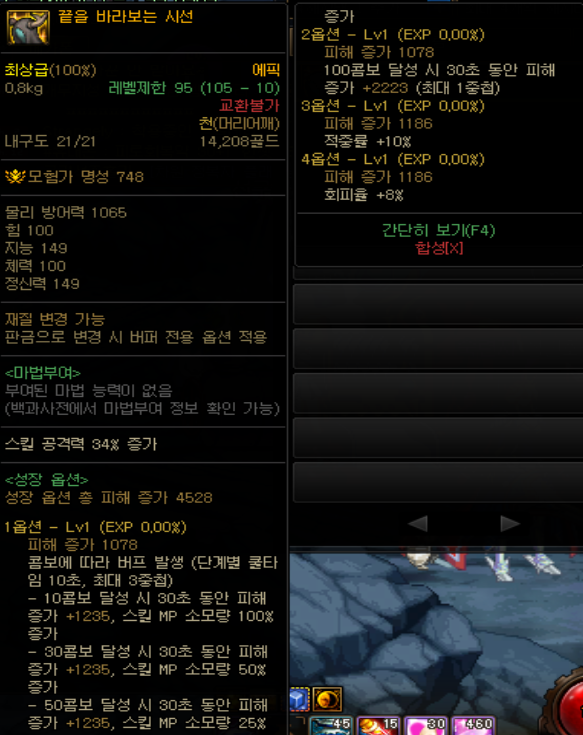 스킬 MP 소모량이 증가하며 총 증가한 MP 소모량 증가의 25%만큼 스킬 공격력이 증가합니다. 또한 MP가 10% 감소할 때 마다 피해 증가가 붙어 있는데, 아칸셋은 이 두 옵션을 잘 활용할 수 있습니다. 단점으로는 MP 소모량이 증가하는 만큼 던전에서 MP가 부족한 상황이 생길 수 있습니다.