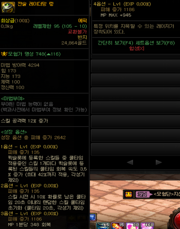 퀵슬롯에 등록한 스킬들의 쿨타임 회복 속도를 빠르게 올려주는 반지입니다. MP와 관련된 옵션도 있어서 아칸셋과도 잘 맞으며 아칸셋이 아니더라도 굉장히 좋은 반지입니다. 스킬을 빨리빨리 돌리고 쿨타임이 긴 스킬들이 퀵슬롯에 많이 등록되어 있을수록 더 효과를 잘 활용할 수 있습니다.