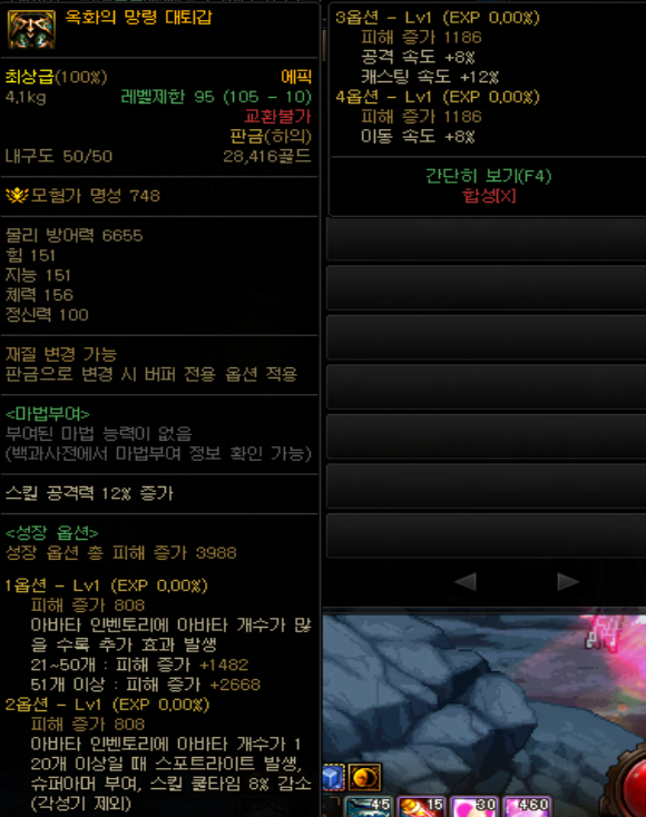 고인물들이 쓰면 좋은 하의 장비로 아바타 인벤토리에 있는 아바타 개수에 따라 효율이 좋아지는 장비입니다. 2옵션의 조건이 아바타 인벤토리에 아바타 개수가 120개 이상이 있는것이기 때문에, 조건을 충족한다면 하의는 옥화의 망령 대퇴갑을 선택하시면 됩니다.