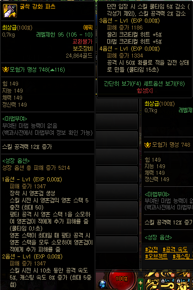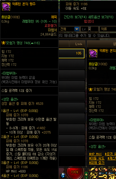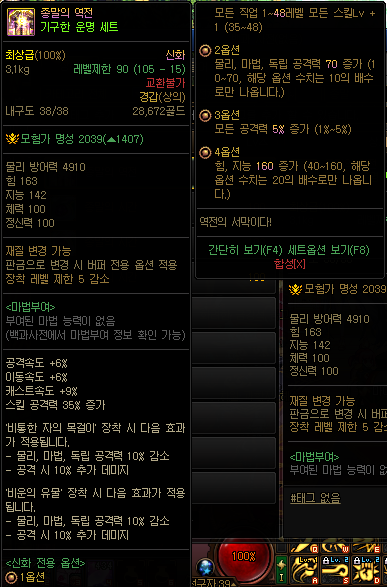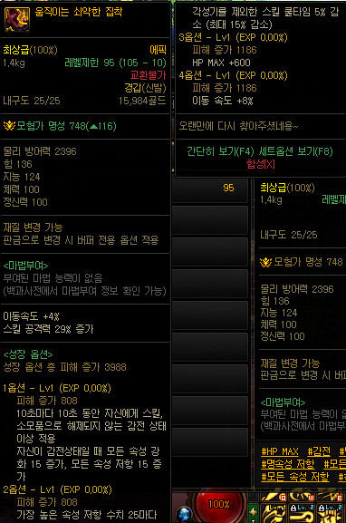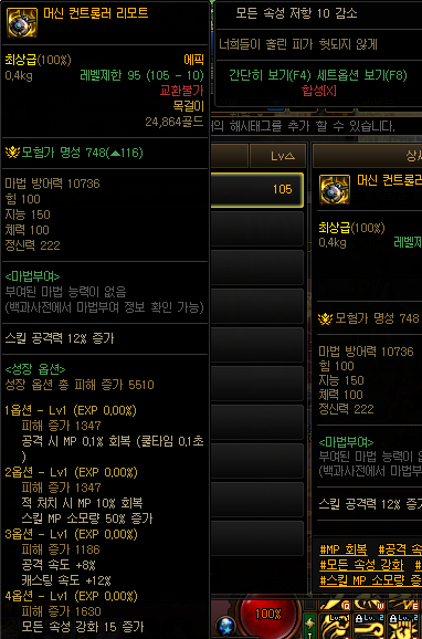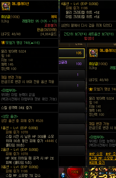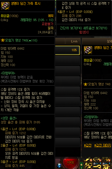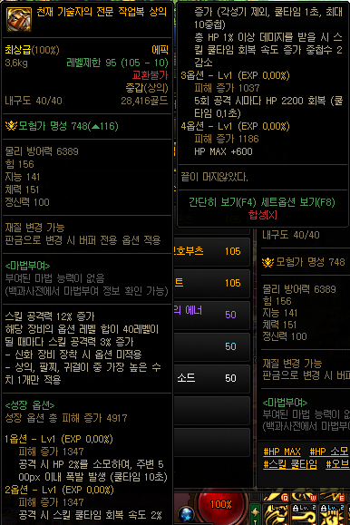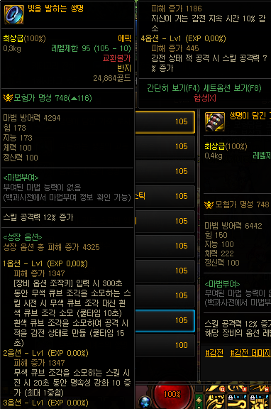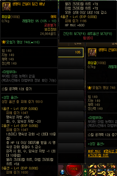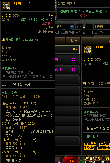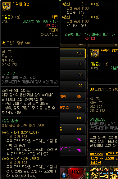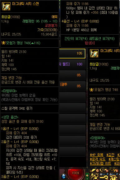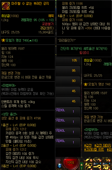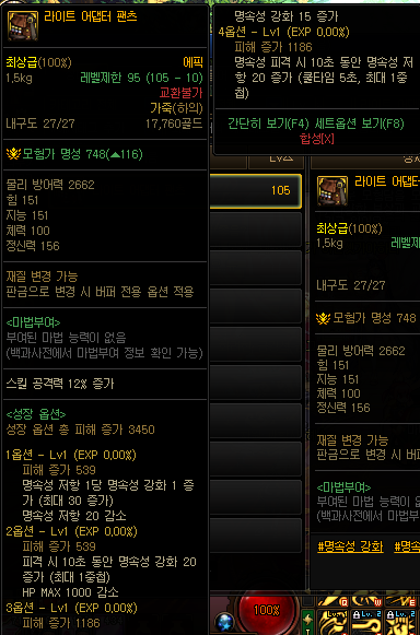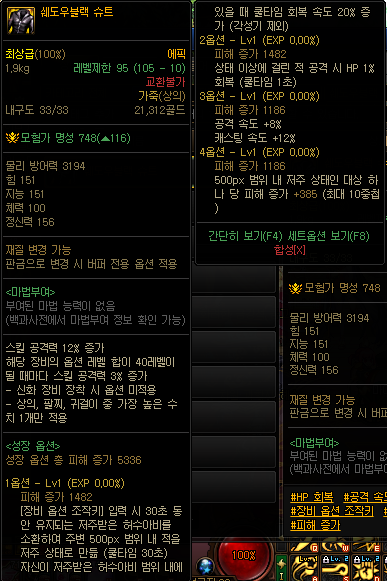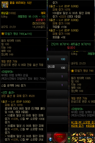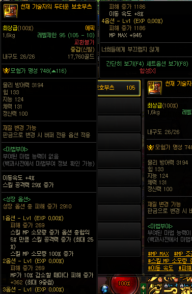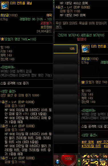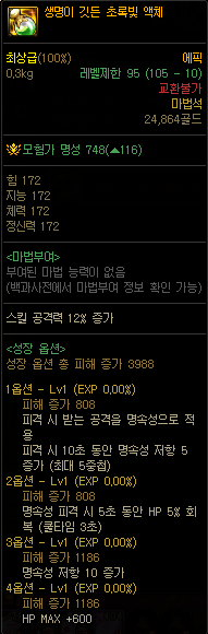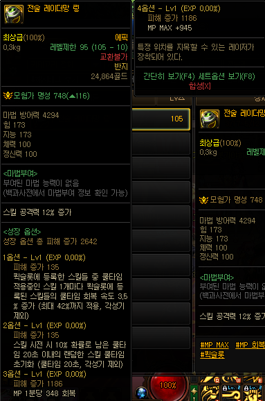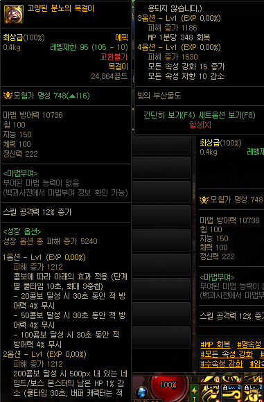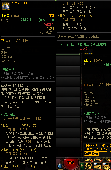 HP와 MP를 항시 90% 이상으로 유지하면 꽤나 좋은 성능을 보여주는 보조장비입니다. 사실 옵션들을 유지하기가 그렇게 쉬운 편이 아니기에 HP, MP관리가 원활한 경우를 제외하곤 그렇게 추천드리지는 않습니다.