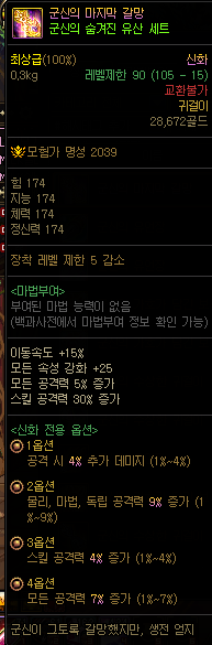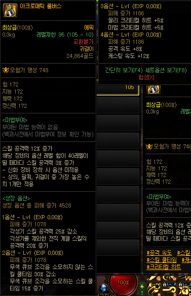 가장 많이 착용하는 신화 상의로, 스킬 공격력 35% 증가입니다. 현재는 신화 장비를 구하기 어렵다면 다른 신화 상의 장비로 대체하는 것도 좋은 방법입니다.