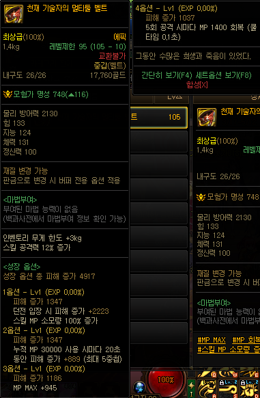 누적 MP 30000 사용 시마다 20초 동안 피해 증가(최대 5중첩) 옵션, 그리고 부족한 마나를 회복시키는 5회 공격 시마다 MP 1400 회복(쿨타임 0.1초) 옵션으로 부족한 MP를 메꿀 수 있습니다. 또한 다단히트 직업일 수록 마나 회복이 잘 되기 때문에 좋습니다. 감전세팅이 아니더라도 다른 세팅에서도 천재 기술자의 두터운 보호부츠와 함께 굉장히 자주 사용되는 벨트입니다.