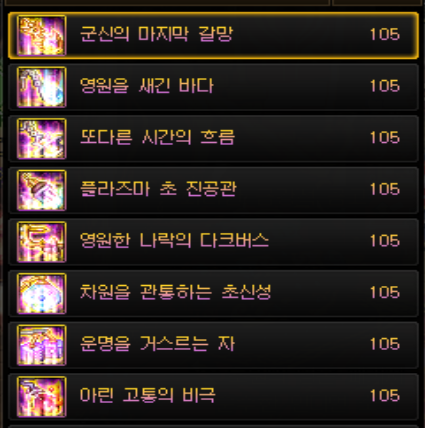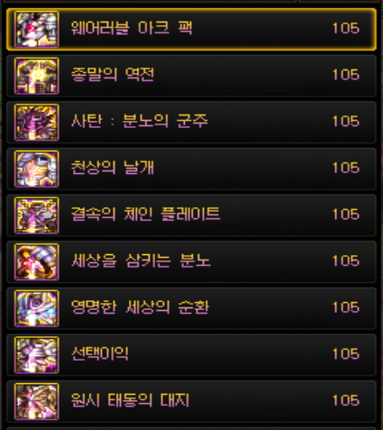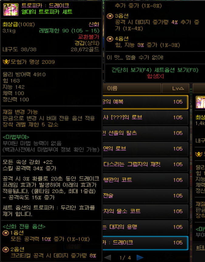 그나마 자주 사용되는 신화 장비 부위는 상의와 귀걸이입니다. 팔찌의 경우 105레벨 에픽 장비 세팅들 중 핵심이 되는게 많다보니 비교적 옵션이 덜한 상의 부위나 귀걸이 부위를 신화 장비로 대체하는 것이죠. 신화 상의의 경우 옵션에 붙어있는 '스킬 공격력 증가'를 보고 선택하는데, 종말의 역전이 스킬 공격력 35% 증가, 사탄 : 분노의 군주, 트로피카 : 드레이크가 스킬 공격력 34% 증가로 제일 많이 채용되는 신화 장비 상의입니다.