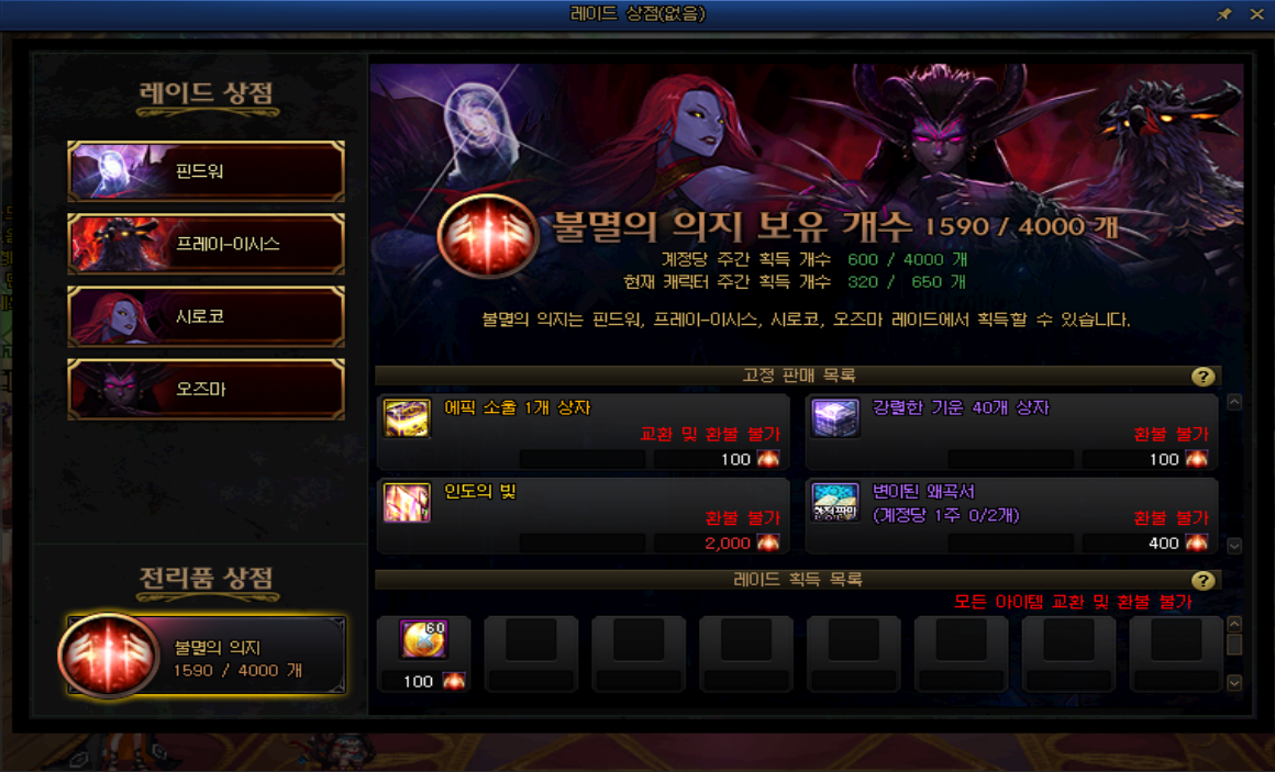 또 레이드 상점 중 불멸의 의지로 구매할 수 있는 상품에도 '인도의 빛'이 추가되었습니다. 한 번 구매하는데 불멸의 의지 2,000개가 필요합니다. 레이드를 돌릴 캐릭터가 많은 경우 더 빠르게 신화 장비를 파밍할 수 있겠죠?