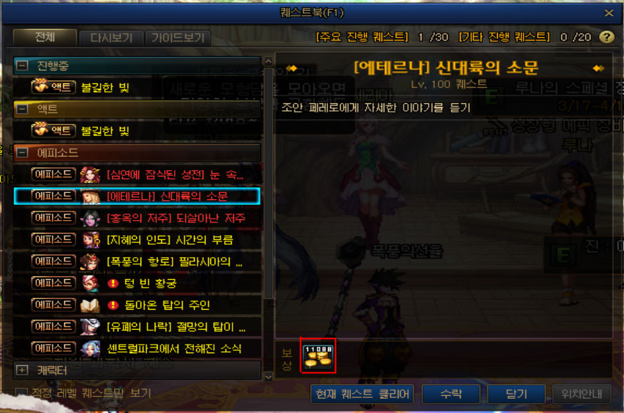 1회성이라는 단점이 있지만, 그래도 한 캐릭터당 한 번씩 가능한 방법입니다. 방법은 굉장히 간단한데요, 퀘스트 창에서 외전 퀘스트나 에피소드 퀘스트, 가이드 퀘스트들을 살펴보면 클리어하지 않았다는 가정 하에 단순하게 특정 NPC를 찾아가는 식의 퀘스트들이 많습니다. 골드는 9천골드 후반에서 1만골드 초반대가 많으며 100레벨 점핑 캐릭터 기준으로 약 40개 정도의 이런 퀘스트들이 있습니다. 그중에서도 많은 퀘스트들이 클리어하면 추가로 다른 NPC를 만나달라고 하거나 하는 연계 퀘스트를 내주고, 마찬가지로 그 보상으로 또 다시 골드를 지급합니다.