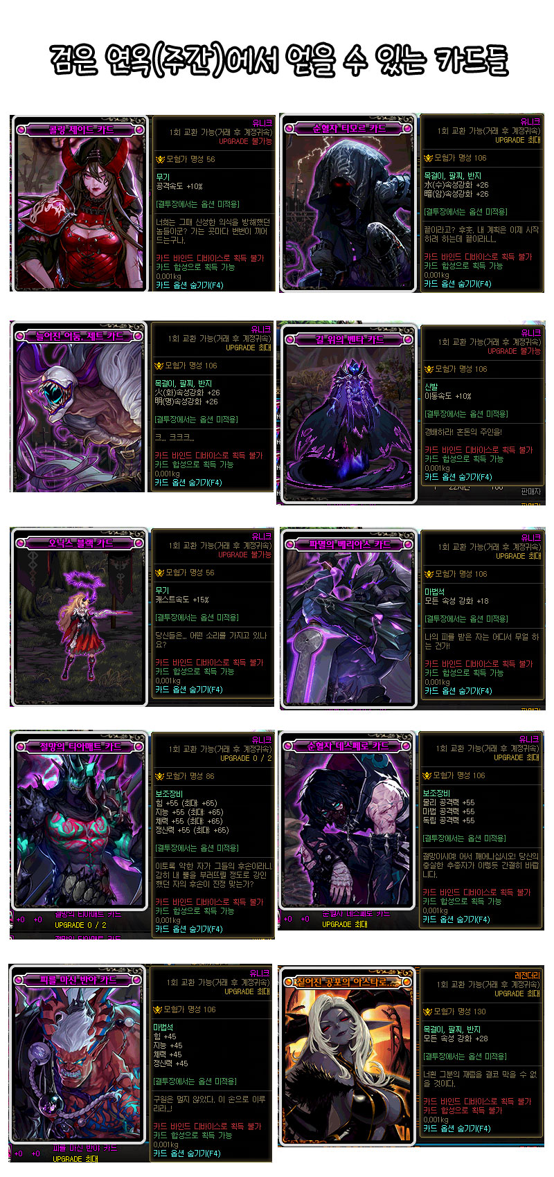 두 번째는 검은 연옥입니다. 검은 연옥도 추방자의 산맥과 마찬가지로 주간 던전으로 클리어하면 여러 보상들을 얻을 수 있습니다. 운이 좋으면 신화 장비도 얻을 수 있고, 그 외에도 오즈마/시로코 에픽을 융합할 100제 에픽을 떨구기도 합니다. 하지만 주간 검은 연옥에서 주된 골드 수입원은 바로 마법부여 카드입니다.