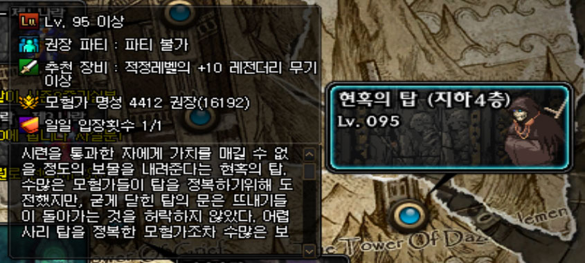 두 번째 망자의 협곡 던전은 바로 현혹의 탑입니다. 유폐의 나락과 마찬가지로 하루 한 번 입장 가능하며 세 캐릭터까지 입장이 가능합니다. 난이도는 마찬가지로 만렙인 경우 클리어하지 못하는게 이상하며 소요 시간도 유폐의 나락과 비슷합니다. 총 지하 7층으로 이루어져 있으며 지하 1층부터 하루에 한 층씩 차례대로 진행됩니다.