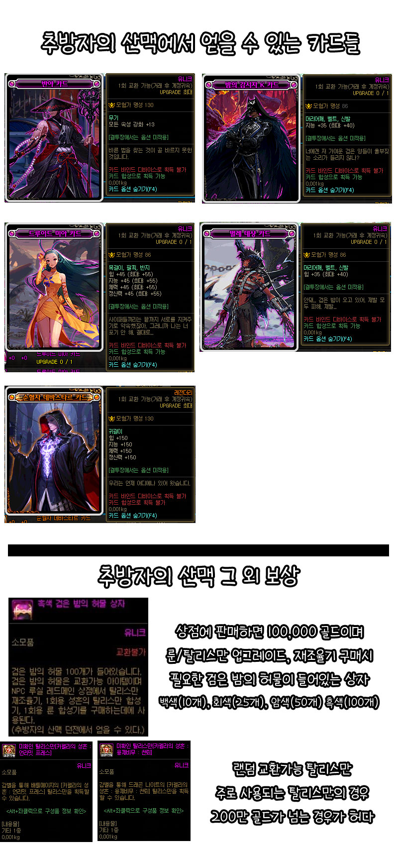 추방자의 산맥 카드들은 사실 순혈자 데바스타르 카드를 제외하곤 그렇게 비싼 편은 아닙니다만, 그래도 유니크 카드이기 때문에 40~50만 골드는 합니다. 또한 가끔씩 나오는 검은 밤의 허물 상자는 그 종류에 따라 최소 100만골드에서 최대 1,000만골드를 보장해줍니다. 교환가능 미확인 탈리스만들 역시 운이 좋아 특정 직업이 반드시 사용하거나 자주 사용되는 탈리스만이 나오면 200만골드 이상은 가뿐히 벌어가죠. 추방자의 산맥을 도는데 필요한 피로도는 고작 8이며, 만렙 기준으로 105레벨 누더기 에픽을 둘둘 하고 있는 사람도 시간이 조금 걸리지만 1인으로 클리어할 수 있을 정도입니다. 가이드 모드의 경우 보상을 얻을 확률이 조금 감소하며 1인 모드와 4인 모드는 보상 차이가 없습니다.
