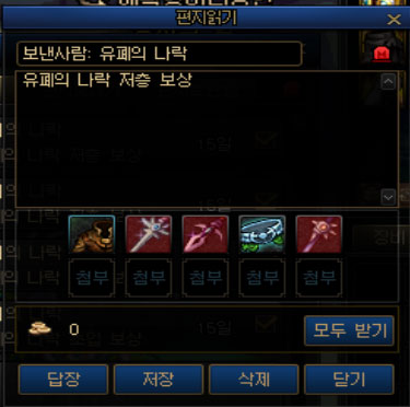 그렇게 돌고 마을로 돌아가면 우편함으로 이렇게 보상이 도착해있습니다. 보상은 언커먼/커먼 장비들이며 전부 상점에 판매했을시 적으면 7만골드, 많으면 9만골드까지 획득이 가능합니다. 매일 세 캐릭터를 꽉 채워 돌린다면 20만~30만 골드씩은 채워지는 셈이죠.