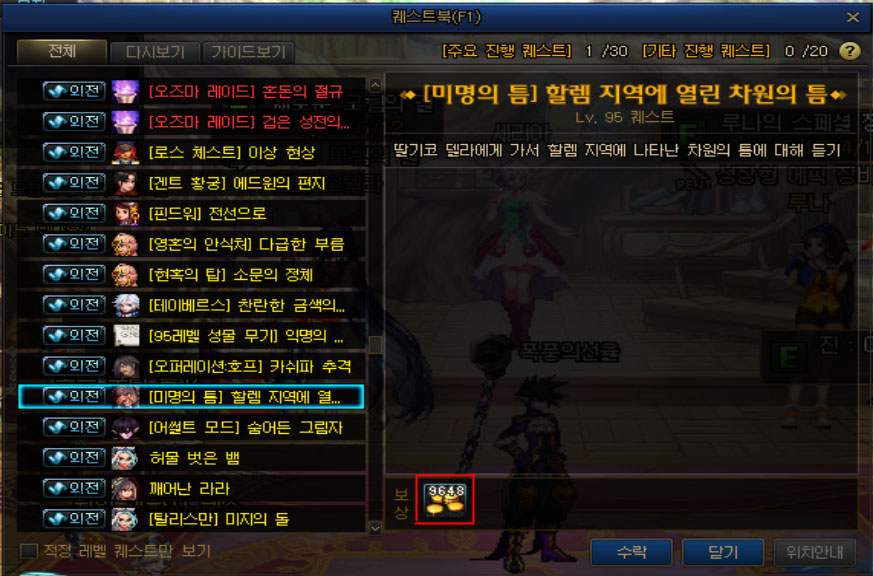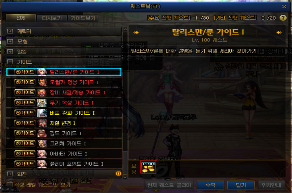 실제로 100레벨 점핑 캐릭터를 가지고 0골드인 채로 에피소드, 가이드, 외전 퀘스트들 중 단순히 찾아가서 말만 거는 퀘스트들을 다 클리어했을 때 인벤토리에는 54만 골드가 쌓였습니다. 다만 일일히 찾아가는게 굉장히 시간이 오래 걸릴 수 있기 때문에 가급적이면 길드 기능의 순간이동 기능을 이용하여 시간을 단축하면 됩니다. 캐릭당이기 때문에 100레벨 캐릭터들 중 이런 것들을 아직 클리어하지 않은 캐릭터가 4개만 되도 200만 골드를 획득할 수 있겠죠?