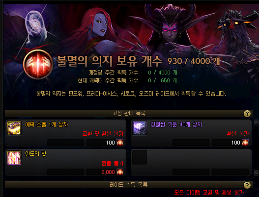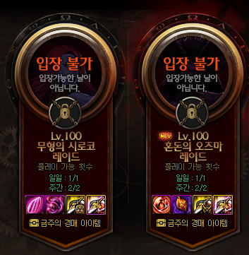 토요일부터 수요일까지 입장 가능한 시로코/오즈마 레이드입니다. 많은 분들이 알고 있다시피 몬스터 카드 외에도 100레벨 에픽, 신화 장비와 더불어 시로코 에픽, 오즈마 에픽이 나오며 기본적으로 레이드들은 돌면 불멸의 의지를 주는데, 이를 통해서 에픽 소울을 수급하거나 인도의 빛을 구매하여 신화 장비를 얻을 수 있습니다. 모이는 꽃잎의 석영과 혼돈의 원념을 통해 카드칩을 구매하여 대박을 노릴 수도 있습니다.