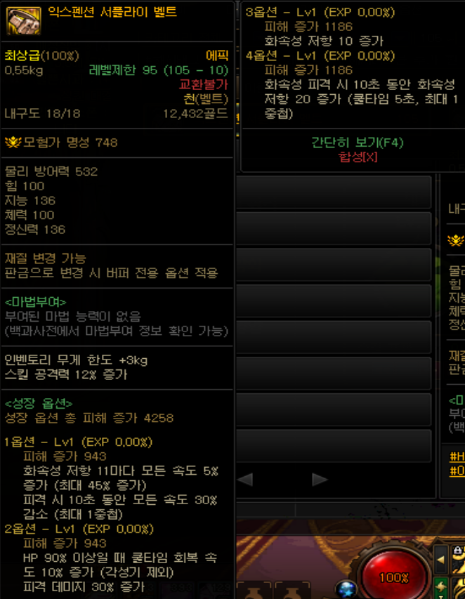 화속성 저항 수치에 따라 모든 속도가 증가하는 벨트입니다. 다만 피격 시 10초 동안 모든 속도 30% 감소라는 리스크 옵션이 있으며 2옵션을 통해 쿨타임 회복 속도를 챙길 수도 있습니다. 화속성 저항이 높다면 1옵션의 리스크를 무시할 수도 있는 벨트로서 채용할 경우 아바타 허리 옵션에서 화속성 저항을 선택하면 좋습니다.