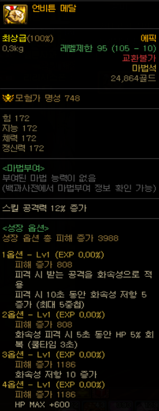 2옵션에서는 화상 전용 쿨감, 3, 4옵션에서는 각각 화속성 강화와 화속성 저항이 증가하는 옵션을 가진 목걸이입니다.