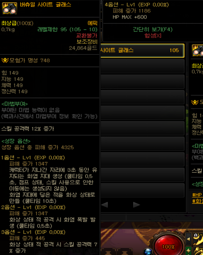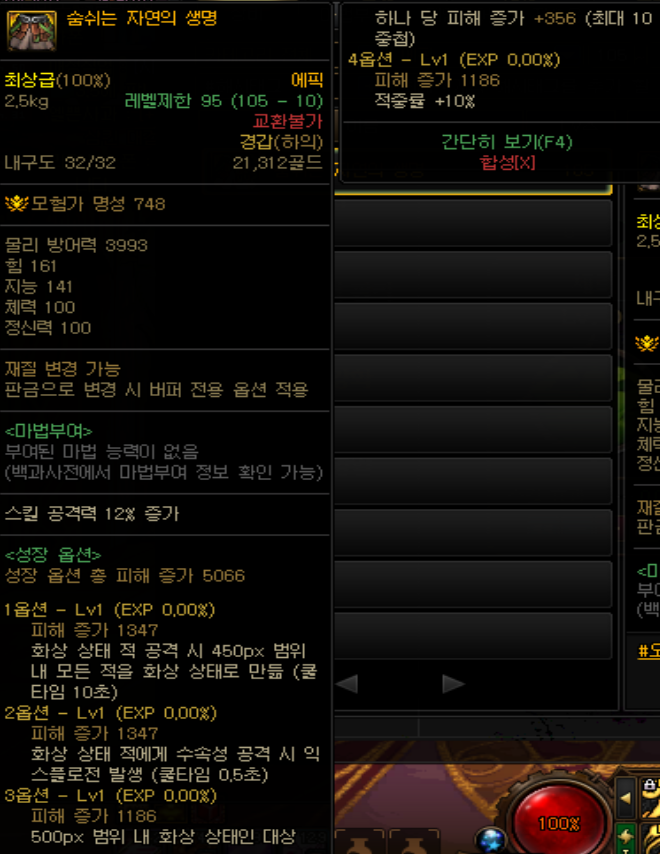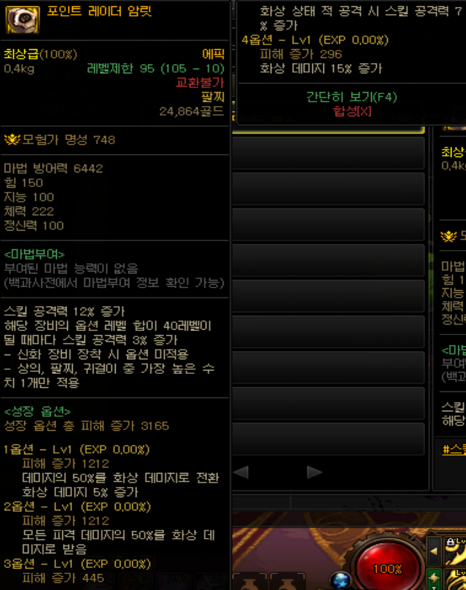 2옵션으로 화속성 강화 150 이상시 물리 크리티컬, 마법 크리티컬 히트가 15% 증가합니다. 자신이 크리티컬이 100이 안된다면 쓸만한 옵션이지만, 요즘에는 크리티컬 100%을 찍는게 어렵지 않다보니, 그래도 화속성 강화와 화속성 저항을 올려주기에 넣어보았습니다.