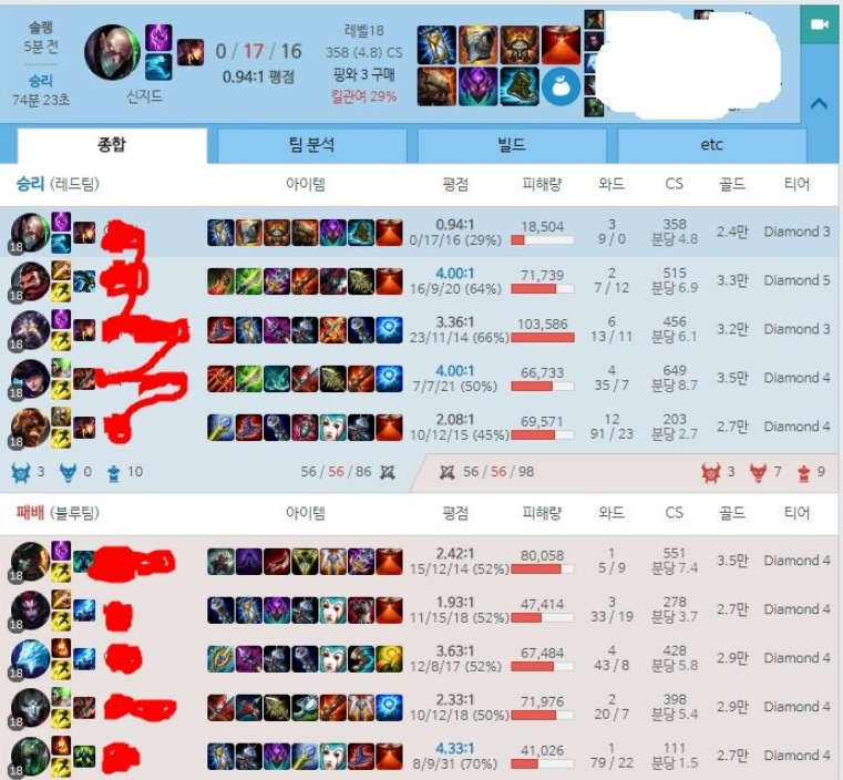 옛날 게임들이지만 첫 번째 게임을 예시로 들면 신지드는 킬을 하나도 못하고 17데스, 16어시로 평점이 1점도 되지 않지만 아군들이 잘 해서 승리한 경우입니다. 두 번째 경우는 자신은 잘 했으나 팀이 잘 받쳐주지 못해 패배한 판이죠. 이 경우들에는 분명히 팀을 잘 만났거나 못 만났기 때문에 승리한 것으로 팀운겜이라고 할 수 있습니다.