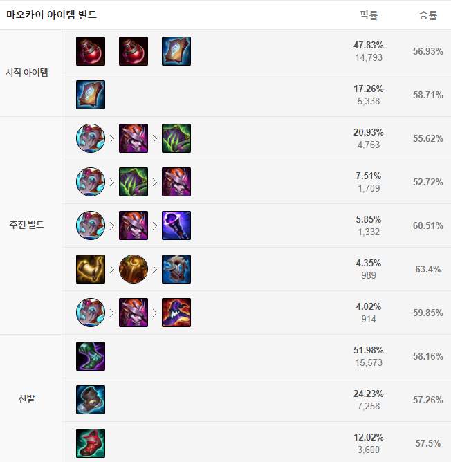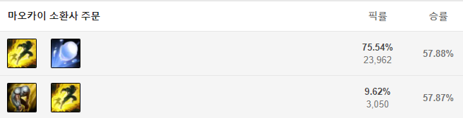기본적으로 점멸과 눈덩이를 들어줍니다. 눈덩이를 통해 적에게 빠르게 접근한 뒤 W스킬, Q스킬, 궁극기로 이니시를 걸 수 있기 때문입니다. 다만 이 경우 대부분 마오카이는 적들의 집중포화를 맞게 되고 사망하게 되지만, 아군들이 처리를 해주는 경우가 많습니다.