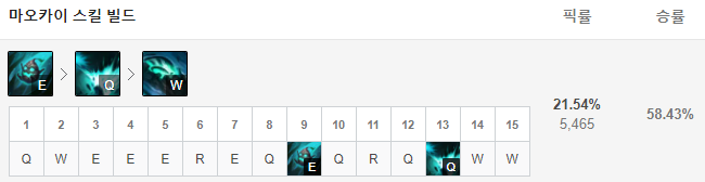 처음 시작 3레벨에는 Q, W, E스킬을 하나씩 찍어주고 4레벨부터는 R-E-Q-W 순서로 스킬을 마스터해줍니다. 마오카이가 이니시를 걸지 않을 때에도 E스킬 묘목 던지기를 통해 적들에게 지속적으로 딜을 넣어주는 역할을 합니다. 또한 부쉬에 던지는 것으로 더 강하게 딜링을 하고, 적들로 하여금 부쉬를 편안하게 활보할 수 없게끔 합니다.