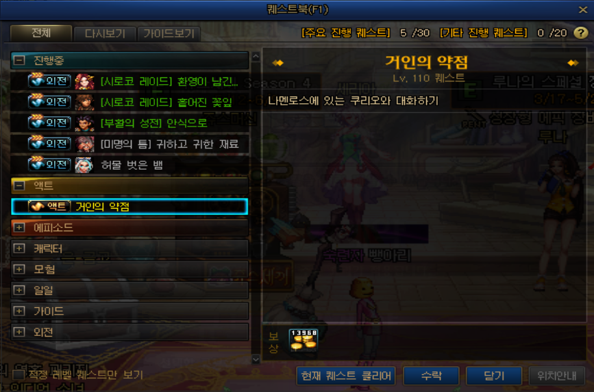 제 캐릭터 명성이 이제 거의 3만 정도로 그렇게 고스펙이 아니기 때문에 노말을 한 번 돌아봤습니다. 우선 110레벨 신규 에픽 퀘스트인 '거인의 약점'부터 시작하는 퀘스트를 전부 클리어해야 입장이 가능합니다. 다 클리어하는데 드는 피로도는 85이므로 더 빨리, 더 많이 마이스터의 실험실을 돌고 싶은 분들은 부캐로 에픽 퀘스트를 클리어해주고 이후 본캐로 '현재 퀘스트 클리어'를 이용해 클리어해주시면 피로도를 절약할 수 있습니다.