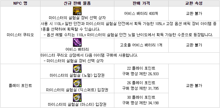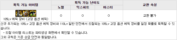 대충 뭐 현재 상급던전들과 보상이 비슷한 형식이며, 몬스터 카드는 새로 추가된 카드로, 악세사리에 적용 가능하며 최대 수치시 각각 '암, 명 속성 강화+35', '화, 수 속성강화+35'입니다. 다른 상급던전들과 가장 큰 차이점이라고 하면 마이스터의 실험실 상급던전에서 획득할 수 있는 신규 105Lv 에픽 장비들이겠죠? 고정 옵션 에픽 장비 11종(무기 제외 각 부위별 1종), 그리고 커스텀 옵션 에픽 장비 11종(무기 제외 각 부위별 1종)입니다.
