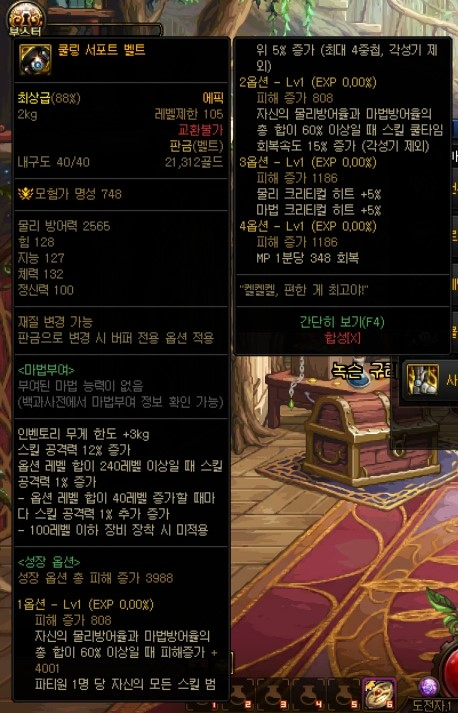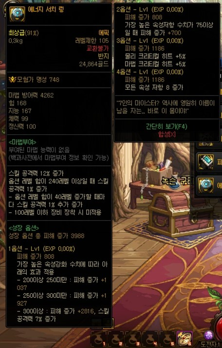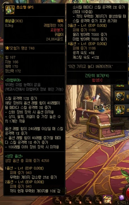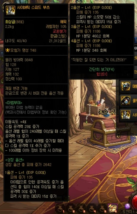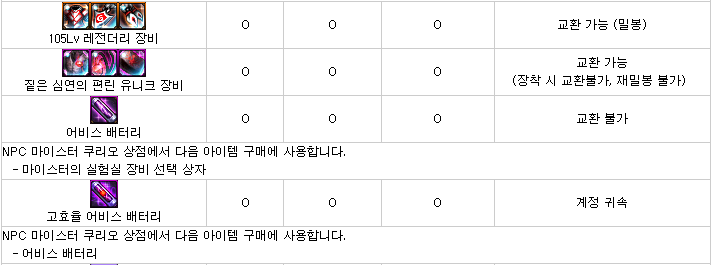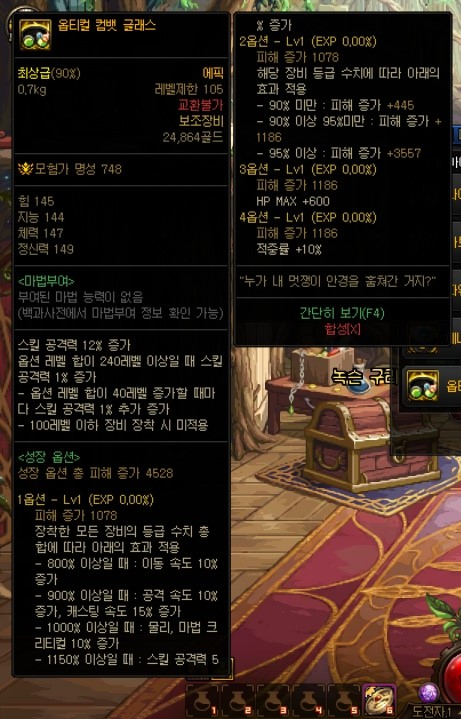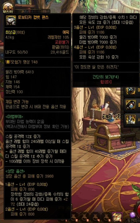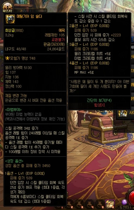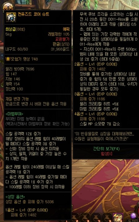 대충 뭐 현재 상급던전들과 보상이 비슷한 형식이며, 몬스터 카드는 새로 추가된 카드로, 악세사리에 적용 가능하며 최대 수치시 각각 '암, 명 속성 강화+35', '화, 수 속성강화+35'입니다. 다른 상급던전들과 가장 큰 차이점이라고 하면 마이스터의 실험실 상급던전에서 획득할 수 있는 신규 105Lv 에픽 장비들이겠죠? 고정 옵션 에픽 장비 11종(무기 제외 각 부위별 1종), 그리고 커스텀 옵션 에픽 장비 11종(무기 제외 각 부위별 1종)입니다.