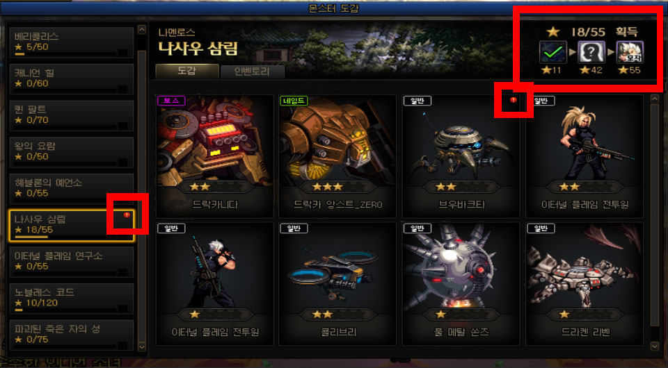 들어가보면 위와 같은 화면이 나올텐데, 현재까지는 일반던전 8종과 상급던전 2종의 몬스터들만 존재합니다. 또한 특정 몬스터 등급을 올릴 수 있을 때에는 오른쪽 윗부분에 알림 표시가 뜨기도 합니다. 보면 알 수 있듯이 몬스터마다 별의 개수(등급)가 다르다는 것을 알 수 있으며, 오른쪽 위를 보시면 모은 별을 일정량 모으면 보상을 획득할 수 있는걸 알 수 있습니다. 던전별로 보상을 얻는데까지 필요한 별의 개수는 다르며, 보상 역시 상이합니다.