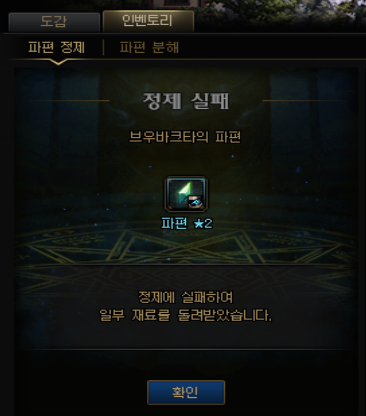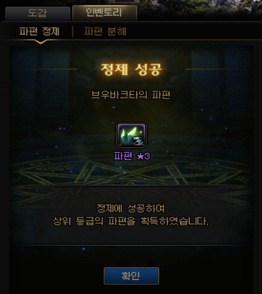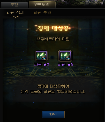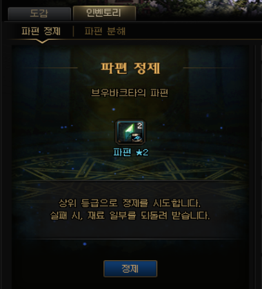 파편 정제는 기본적으로 2개의 파편이 소모되며 실패하는 경우 같은 등급의 파편 한 개를 돌려받고, 성공하면 상위 등급의 파편 한 개를, 그리고 대성공을 하게 되면 상위 등급의 파편 두 개를 받게 됩니다.