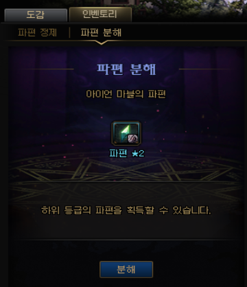 파편 분해는 특정 등급의 파편 하나를 소모하여 하위 등급의 파편 하나를 획득할 수 있습니다. 상위 등급의 파편을 소모해 하위 등급의 파편을 얻는다는 점에서 파편 분해 시스템이 왜 있는지 궁금한 분들도 계실겁니다.