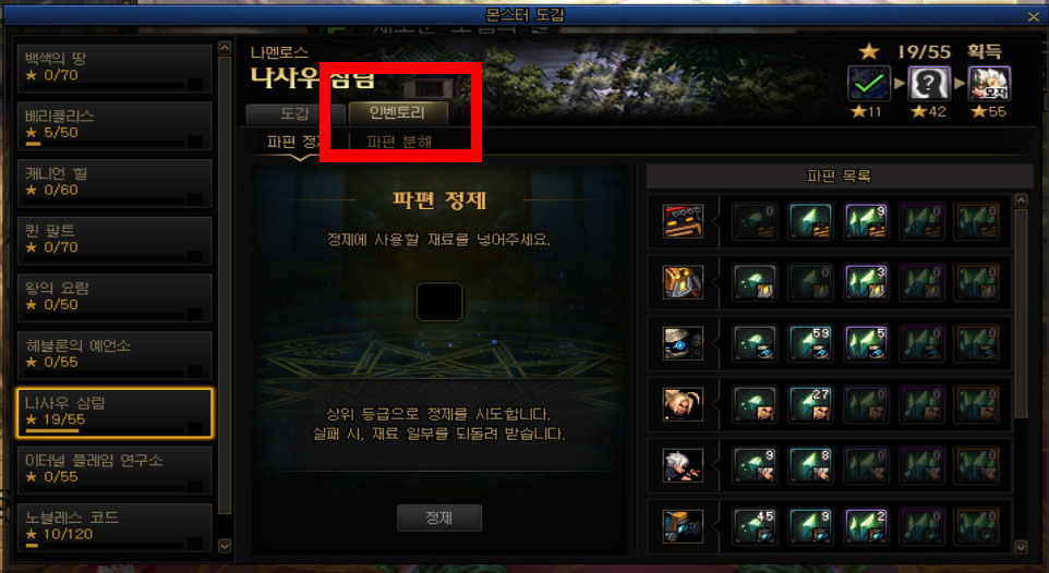 몬스터도감에서 던전을 클릭하고 이후 도감 왼쪽탭에 있는 인벤토리를 누르면 현재 모은 파편 목록을 확인할 수 있습니다. 파편은 1성부터 5성까지 있으며, 던전의 난이도가 높아지면 높아질수록 더 별이 많은 파편을 획득할 수 있습니다.