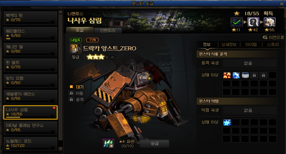 몬스터도감에서 던전을 클릭하고 이후 도감 왼쪽탭에 있는 인벤토리를 누르면 현재 모은 파편 목록을 확인할 수 있습니다. 파편은 1성부터 5성까지 있으며, 던전의 난이도가 높아지면 높아질수록 더 별이 많은 파편을 획득할 수 있습니다.