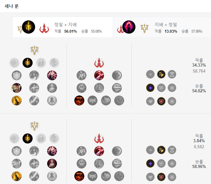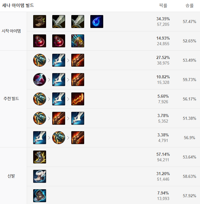 칼바람 세나 룬은 정밀 빌드에서 치명적 속도를 메인 룬으로 사용합니다. 하위 룬으로는 킬관여시 마나를 회복시켜주는 침착, 공격 속도가 오르는 전설: 민첩함, 체력이 낮은 적에게 더 높은 데미지를 주는 최후의 일격을 들어주며 보조룬으로는 지배에서 흡혈을 위한 피의 맛, 골드 수급을 위한 보물 사냥꾼을 들어주면 됩니다. 룬 파편의 경우 공격 속도, 적응형 능력치, 방어력을 들어줍니다.