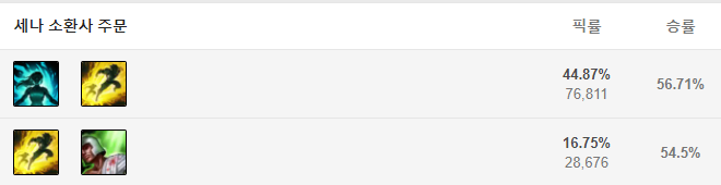 칼바람 나락 세나는 원딜 포지션과 같습니다. 따라서 스펠은 일반 원딜들이 드는 것과 마찬가지로 점멸 + 정화를 들거나 혹은 점멸 + 회복을 들어주면 됩니다.