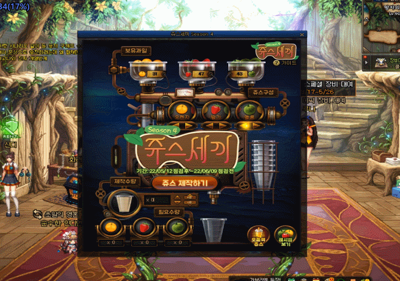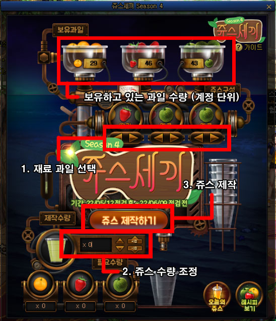 좌우 버튼을 눌러 쥬스에 사용될 과일을 고를 수 있습니다. 어떤 과일이 얼마나 사용되는지에 따라 등장하는 쥬스가 다르며, 쥬스는 총 10종류가 존재합니다. 던파 쥬스 레시피 표는 아래에 첨부해두었습니다.