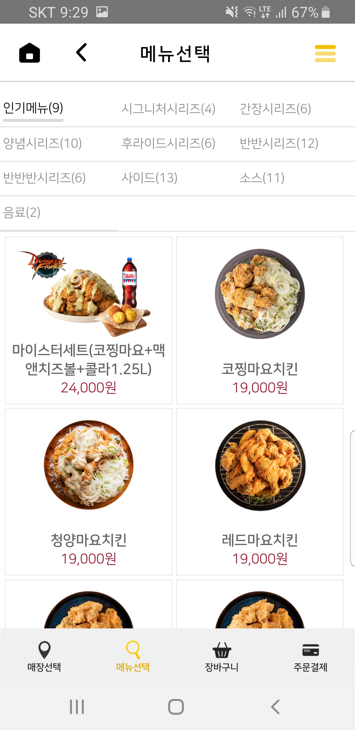 매장을 골라준 뒤 이벤트 진행중인 마이스터 세트를 선택했습니다. 마이스터 세트는 코찡마요, 맥앤치즈볼, 콜라1.25L로 구성되어 있고, 가격은 24,000원입니다. 여기에 순살로 바꾸는데 2,000원, 그리고 배송비 2,000원 해서 총 28,000원이 소모되었네요.