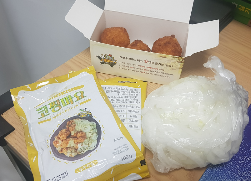 여기에 이제 양파 부어주고 소스 부어준 뒤 먹었습니다. 맛에 대해 평가를 하자면 이미 '소스 2개 다 넣으면 엄청 맵다, 하나만 넣어라'라는 말을 봤었지만, 까짓거 얼마나 맵겠냐며 두 개를 다 넣었습니다. 원래 와사비 느낌의 매운맛도 좋아하기에 더욱 거리낌 없었는데요, 처음 먹는 순간 진짜 이건 아니다 싶을 정도로 코가 찡했습니다. 그냥 치킨에 와사비 소스가 아니라 와사비를 발라서 먹으면 이런 느낌이 아닐까 싶었습니다. 그러나 먹으면 먹을수록 적응했는지 점점 찡한 강도가 낮아졌고 맛있게 먹었습니다. 동생과 함께 먹었는데 맥주랑 먹어서 그런지는 몰라도 다 먹지 못하고 남은건 냉장고에 넣어두었습니다.