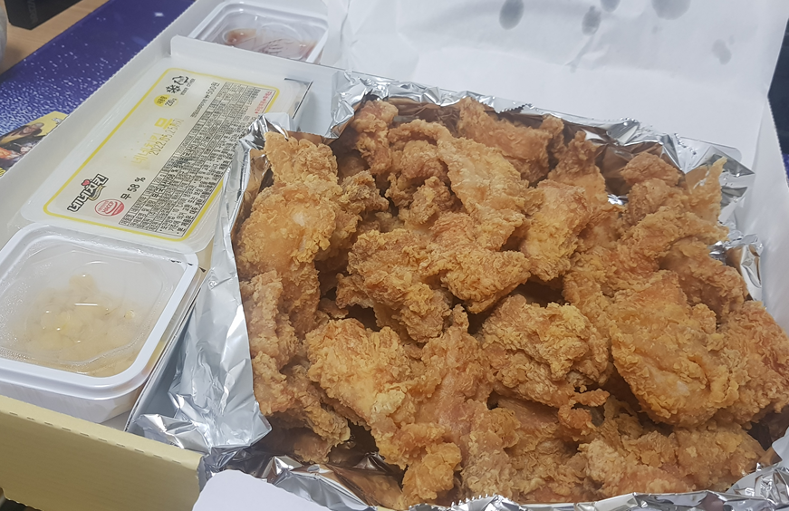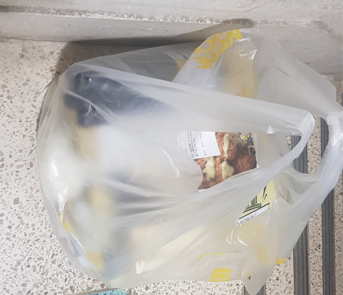 노크 후 문 앞에 놔달라고 부탁하고 주문 후 30분 정도 지났을까, 노크 소리가 들렸고 이내 치킨을 발견할 수 있었습니다.