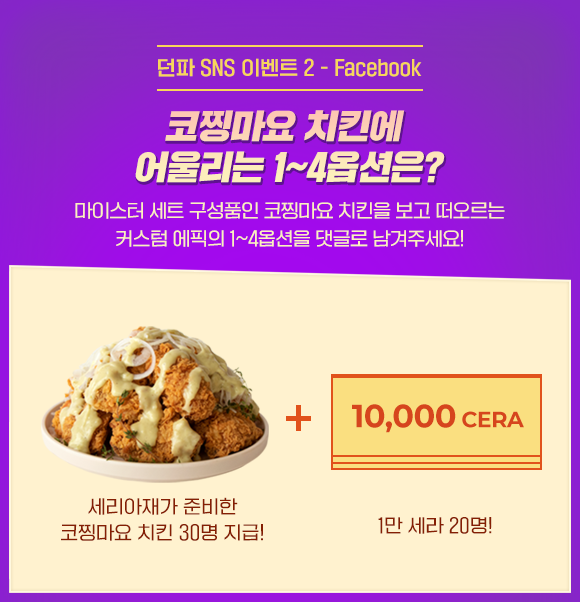 던파 X 네네치킨 마지막 이벤트는 바로 SNS 이벤트입니다. 인스타그램과 페이스북을 통해 진행할 수 있으며, 이 이벤트는 굳이 치킨을 주문하지 않더라도 참여할 수 있습니다. 다만 무조건 보상을 주는게 아니라 추첨을 통한 방식이기 때문에 참여하더라도 보상을 얻지 못할 수도 있습니다. 아래 링크들을 통해 각각 인스타그램, 페이스북으로 들어가서 로그인 후 이벤트에 참여할 수 있습니다.