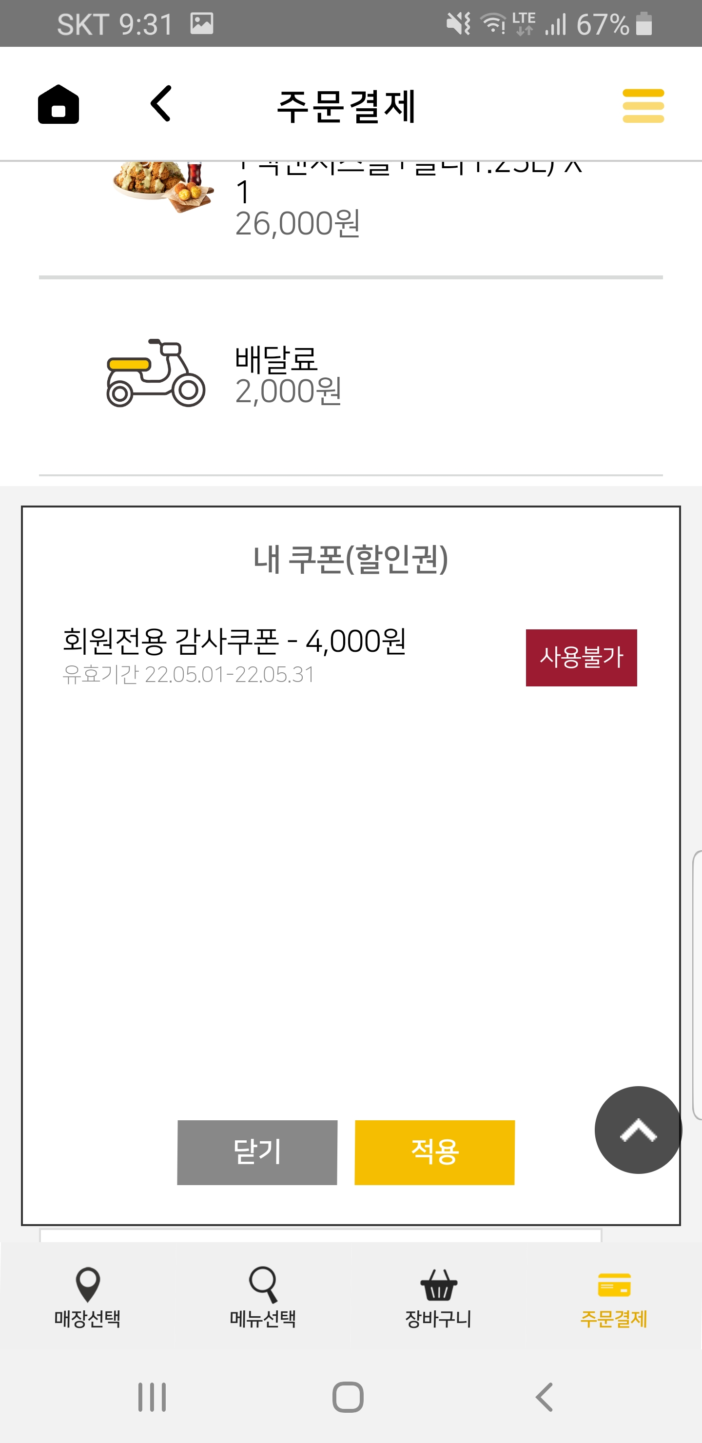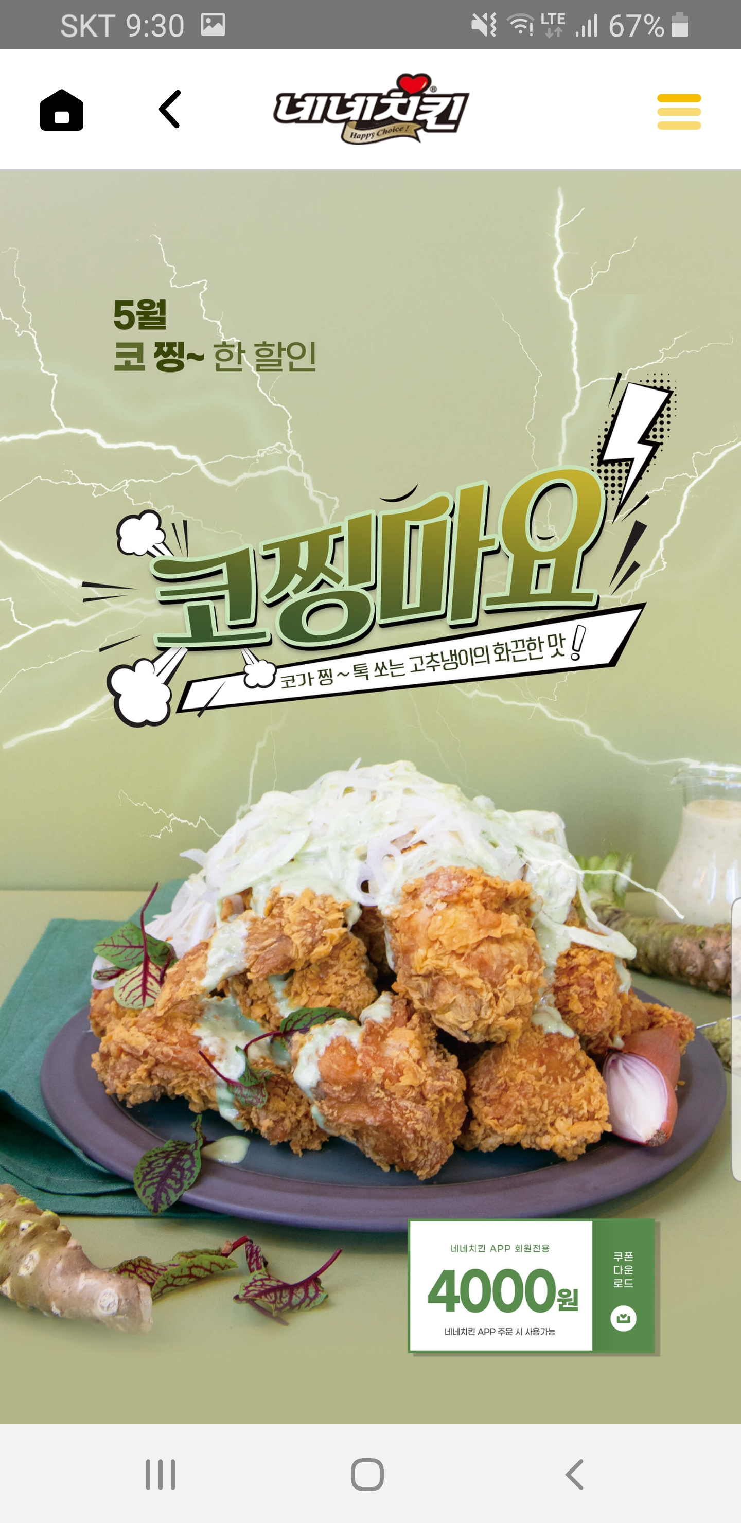 참고로 코찡마요 치킨이 이번에 새로 나온 제품이라 그런지 네네치킨 어플을 통해 결제하는 경우 4,000원 할인받을 수 있는 쿠폰을 지급해주는데, 마이스터 세트와는 함께 사용이 불가능했습니다.