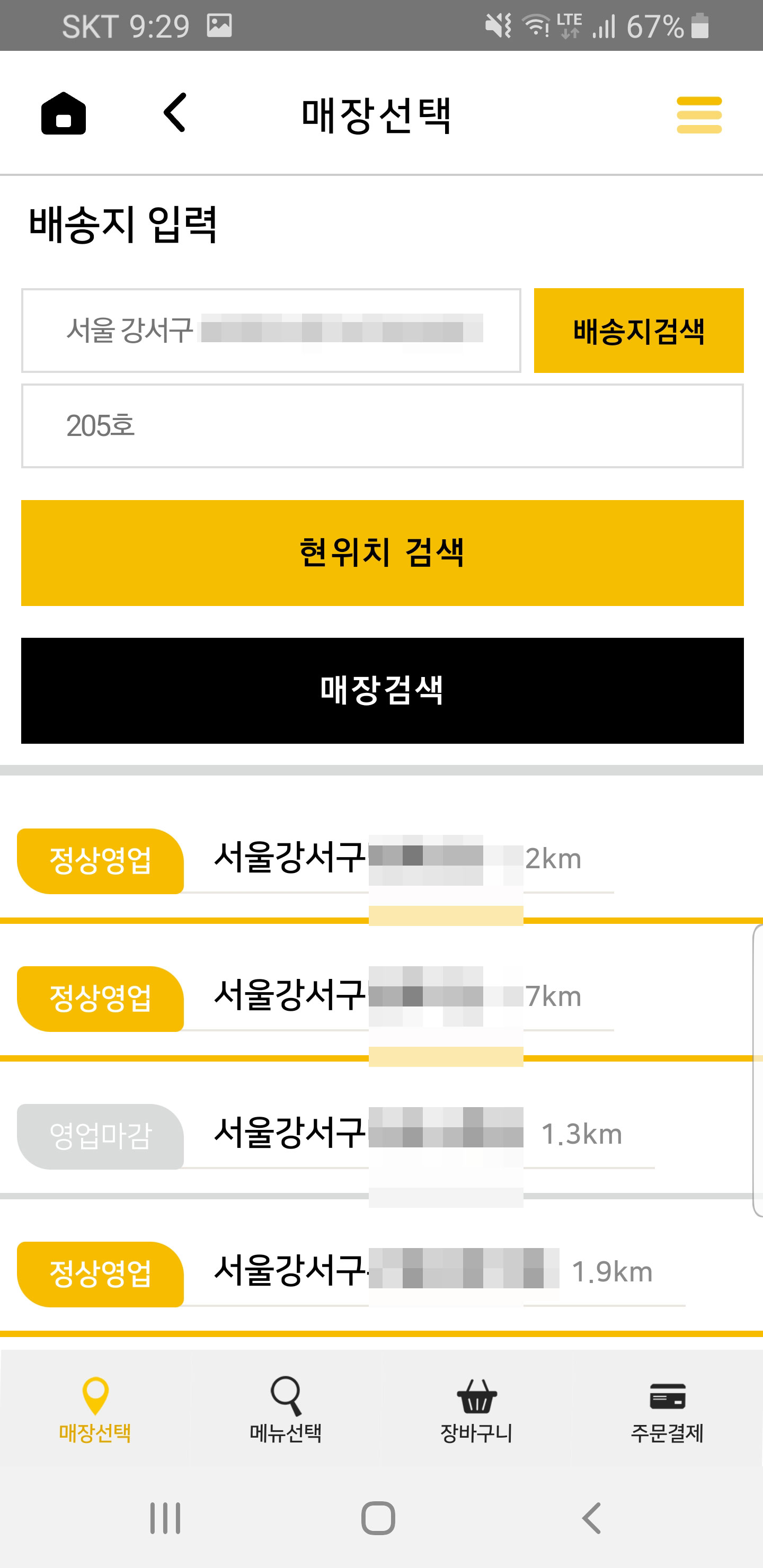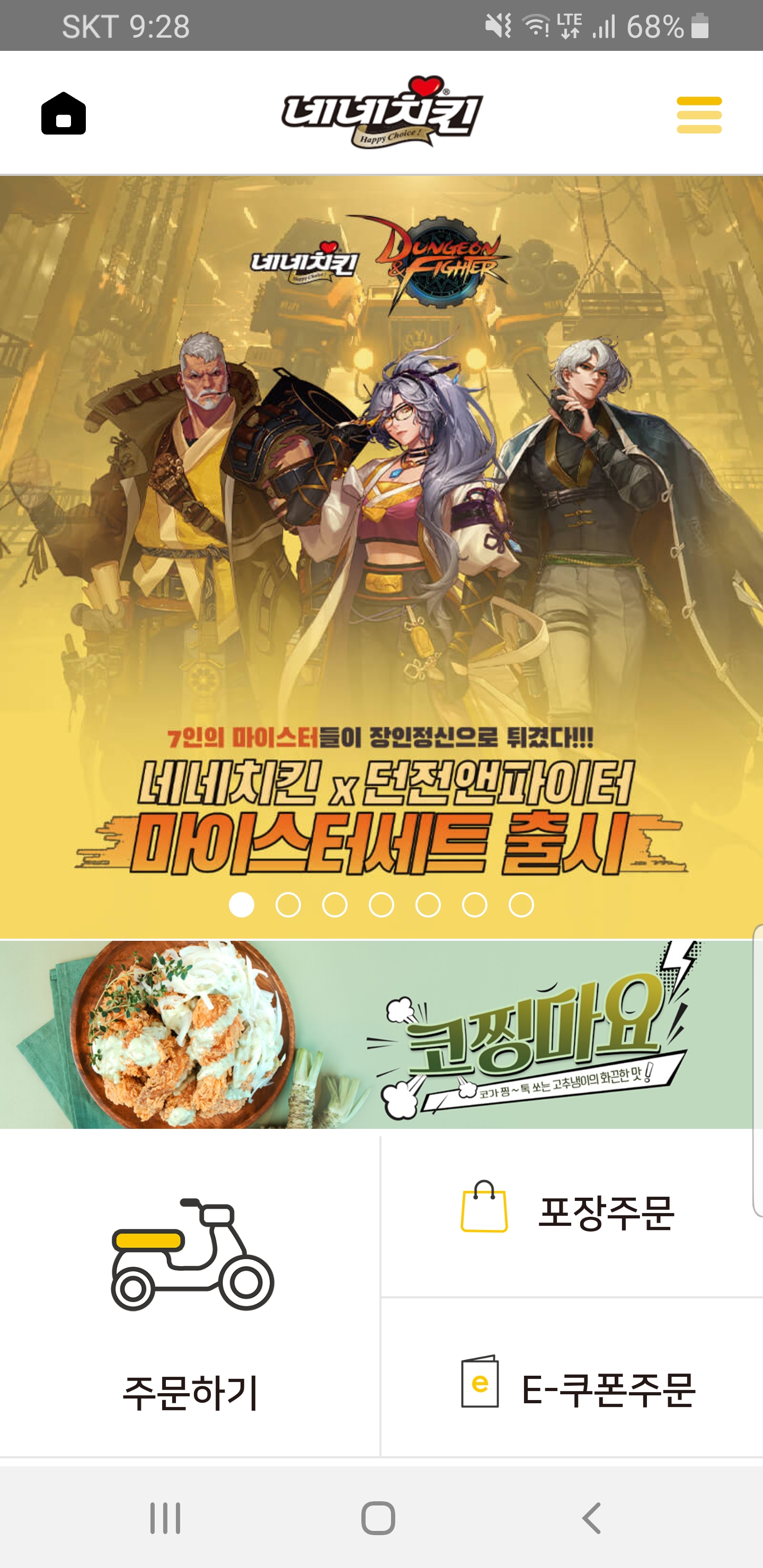 네네치킨 어플 설치하자마자 크게 보이는 던전앤파이터 X 네네치킨 콜라보 배너, 회원가입 후 주문하기를 누르니 먼저 주소를 입력하라고 나옵니다.