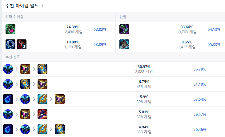 처음 시작은 부패 물약으로 시작해주는게 좋으며, 템트리는 만년서리 - 그림자 불꽃 - 존야의 모래시계 순으로 올리면 됩니다. 상대가 제드나 야스오, 탈론같은 AD 챔피언인 경우 그림자 불꽃보다 존야의 모래시계를 먼저 띄우시는 것도 좋은 방법입니다. 신발은 만년서리가 나온 뒤에 마법사의 신발로 업그레이드 해주시면 되며, 여기까지 완성되었다면 이후에는 상황을 보고 템트리를 올려주면 됩니다.