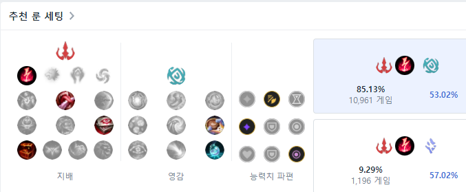 미드 탈리야 룬은 지배에서 감전을 메인으로 합니다. 하위 룬은 피의 맛, 사냥의 증표, 보물 사냥꾼을 들어주면 되고, 보조 룬은 영감 탭에서 비스킷 배달과 시간 왜곡 물약을 들어줍니다. 능력치 파편은 공격 속도와 적응형 능력치, 그리고 상대방 미드가 AP인지, AD인지에 따라 마법 저항력 또는 방어력을 들어주면 됩니다.