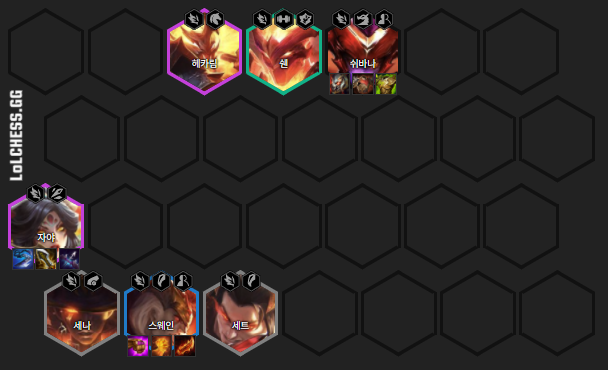 기본 구성은 세나, 세트, 쉔, 스웨인, 자야, 헤카림, 쉬바나입니다. 메인 딜러는 자야, 서브 딜러는 스웨인이며 탱커 역할은 쉬바나가 담당합니다.