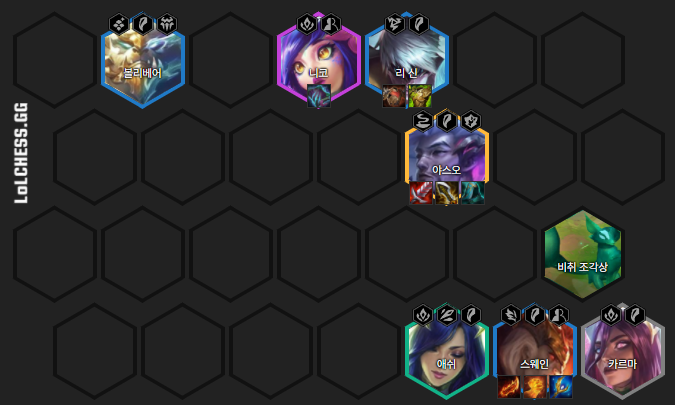 카르마, 애쉬, 리신, 볼리베어, 스웨인, 니코, 야스오로 이루어져 있습니다. 운이 좋다면 7레벨에 야스오를 뽑아 덱을 완성시킬 수 있지만 힘든 편이기에 보통 8레벨까지 달성해주고 분노날개를 하나 넣어 분노날개(3) 시너지까지 받아 스웨인을 더욱 강력하게 만드는 편입니다.
